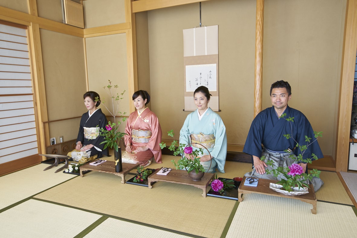 SUIBOKUKA TEMAE refers to the performance of flower arrangement in the same ceremonial manner as the tea ceremony, while at the same time reciting a meaningful waka poem.